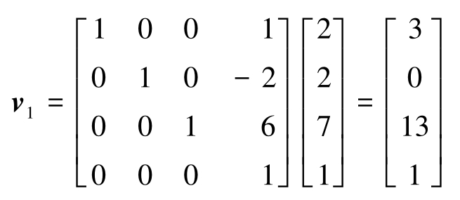 例:矢量2 i + 2 j + 7 k 被矢量 i -2 j + 6 k 平移后得到的新矢量 v 1 为