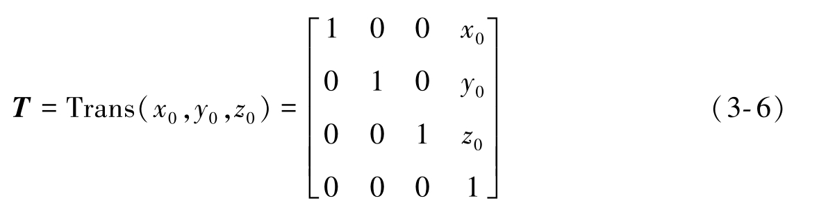 空间中某点由矢量 a i +b j +c k 描述。 i 、 j 、 k 分别为 x 、 y 和 z 轴上的单位矢量。那么,此点可用平移齐次变换表示为