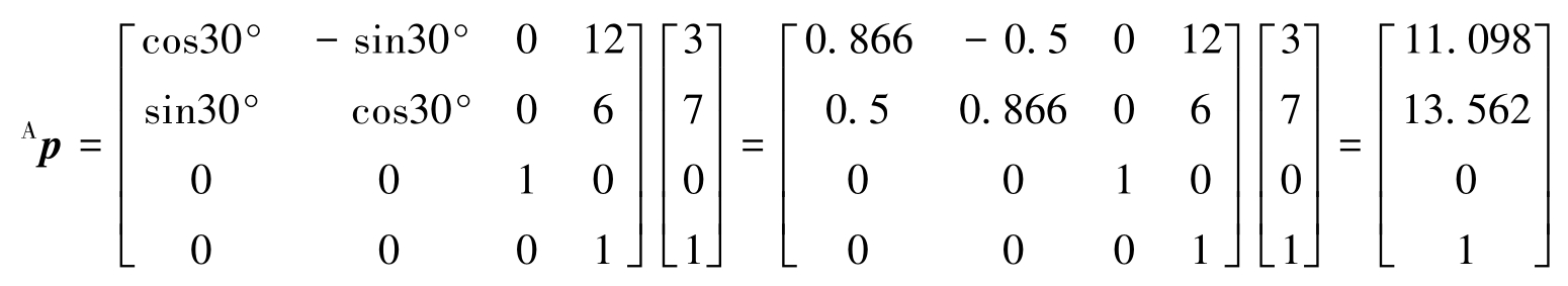 例:已知坐标系{B}的初始位姿与坐标系{A}重合,首先坐标系{B}绕坐标系{A}的 z A 轴旋转30°,再沿坐标系{A}的 x A 轴移动12单位,并沿坐标系{A}的 y A 轴移动6单位。假设点 p 在坐标系{B}的描述为 B p =[3 7 0],求它在坐标系{A}中的描述 A p 。