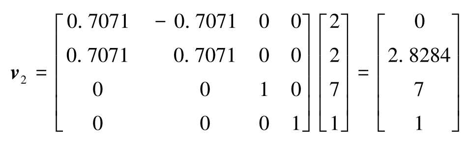 例:将矢量2 i + 2 j + 7 k 绕 z 轴旋转45°后得到新的矢量 v 2 。
