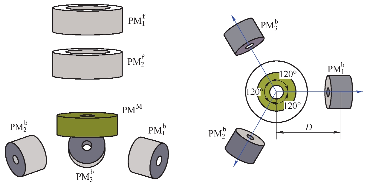 图3-7为环形永磁体之间相对位置的三维图,可以看出,三个固定环形永磁体PM