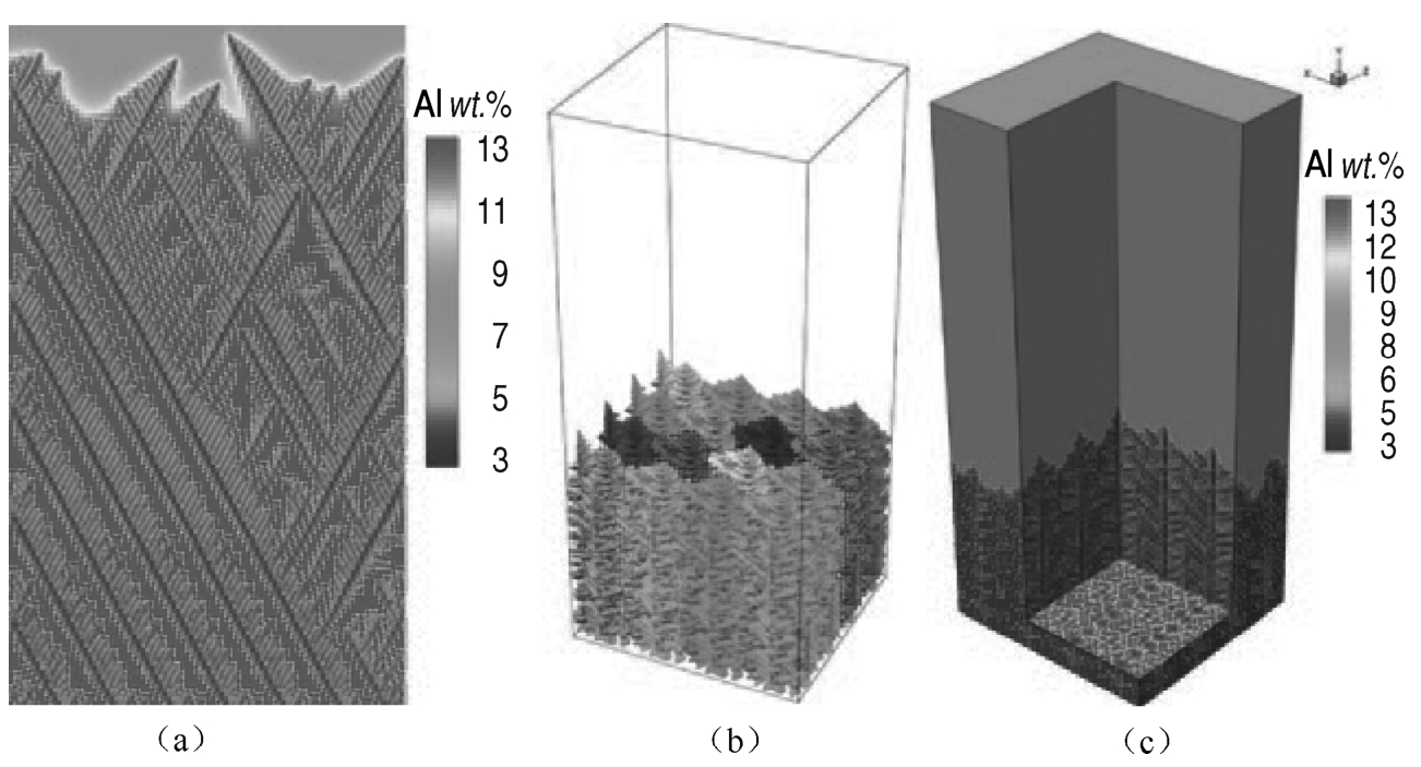 The simulated morphology of equiaxed and columnar dendrites of AZ91D Mg alloy is shown in Figures 2 and 3.It can be seen that the present model reproduces the Mg dendrites pretty well and provides details about texture, solute segregation, and growth anisotropy and competition.