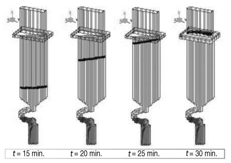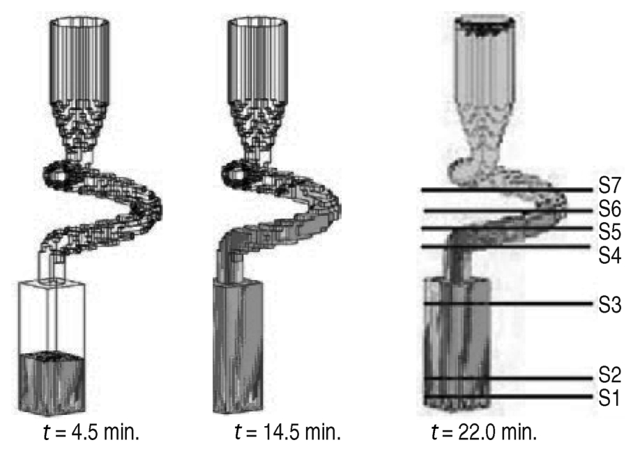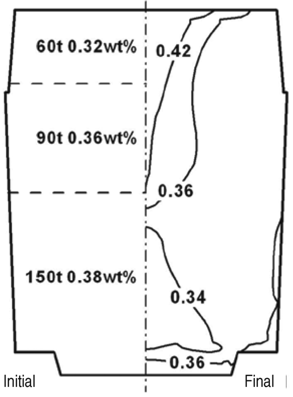 The simulation was carried out for a large 300-t steel ingot (Fe-0.36wt.%C) 4.5 m in height and 3.4 m in mean width. Teeming was ignored, and no superheat was considered for the molten steel. The schematic of MP process is shown in the left side of Figure 14, showing that the first ladre contains 150-t molten steel, the second 90-t and the third 60-t, while the final macrosegregation pattern of carbon in the right side of Figure 14.