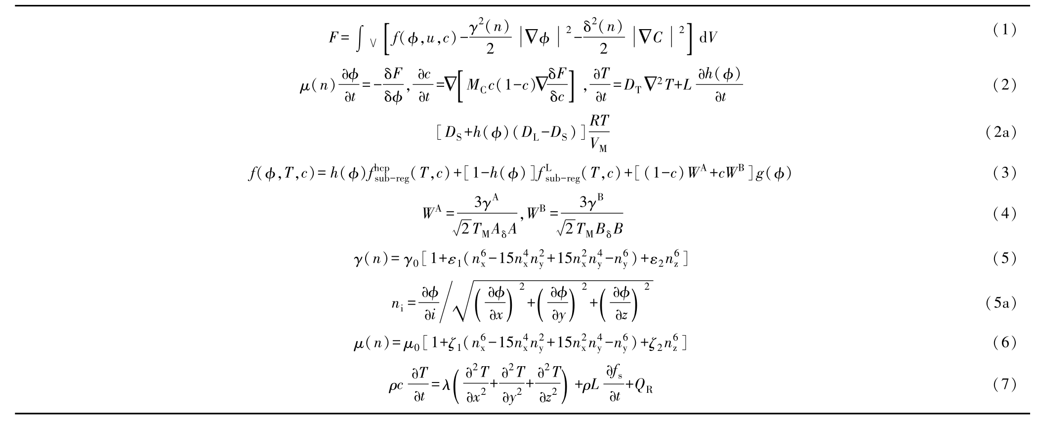 The total free energy of the twophase system is described by a phenomenological Ginsburg-Landau modelas Equation 1, where F is the total free energy of the system, f (φ,u,c) is the free energy density function, φis the phase field variable parameter ranging from negative one in the liquid to positive one in the solid, u and c are the temperature and concentration, respectively, and γ(n) and δ(n) are the gradient energy and concentration field coefficient, respectively. (All equations can be found in the table) The governing equations based on thermodynamic theory for the phase-field coupled with temperature field and solute field can then be expressed as Equation 2.In this equation, μ(n) is the kinetic coefficient, M C is a concentration mobility parameter and is set as shown in Equation 2a. In this equation, h (φ) is the solid fraction given by ϕ 2 (3-2ϕ), D T is the thermal diffusion coefficient, L is the latent heat.