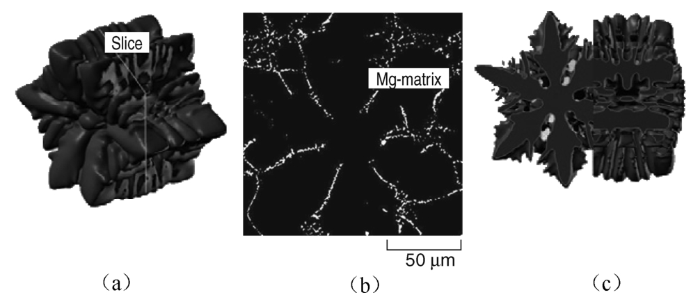 Fig. 1 Simulated result of dendrite morphology of magnesium alloy microstructures (Mg-9wt.% Al). (a) Three-dimensional morphology; (b) synchrotron-radiation-based x-ray tomography slice extracted showing hcp phase patter; (c) related sectional patter results from 3-D simulations.