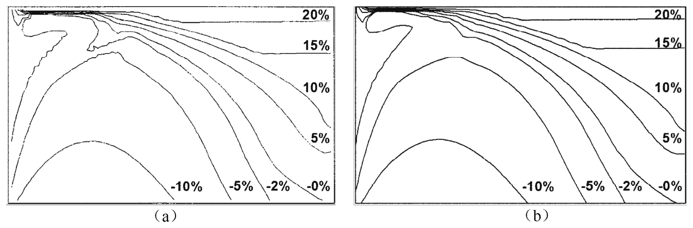 Fig. 13 Macrosegregation map in a solidifying cavity at t=400 s. (a) Existing simulation; (b) present simulation.