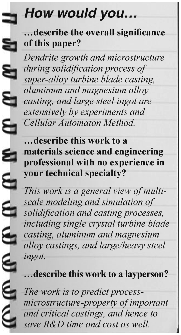 [12]Liang Huo, Zhiqiang Han, and Baicheng Liu, "Twoand Three-dimensional Cellular Automaton Models for Simulating Dendrite Morphology Evolution of Cast Magnesium Alloys" (Presented at the 139th TMS Annual Meeting and Exhibition,Washington State Convention Center,Seattle,14-18 February 2010).