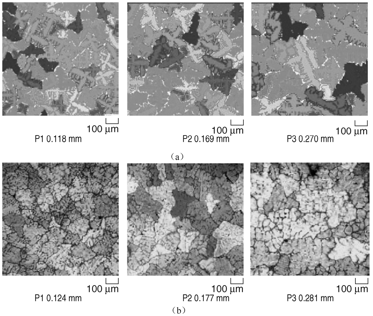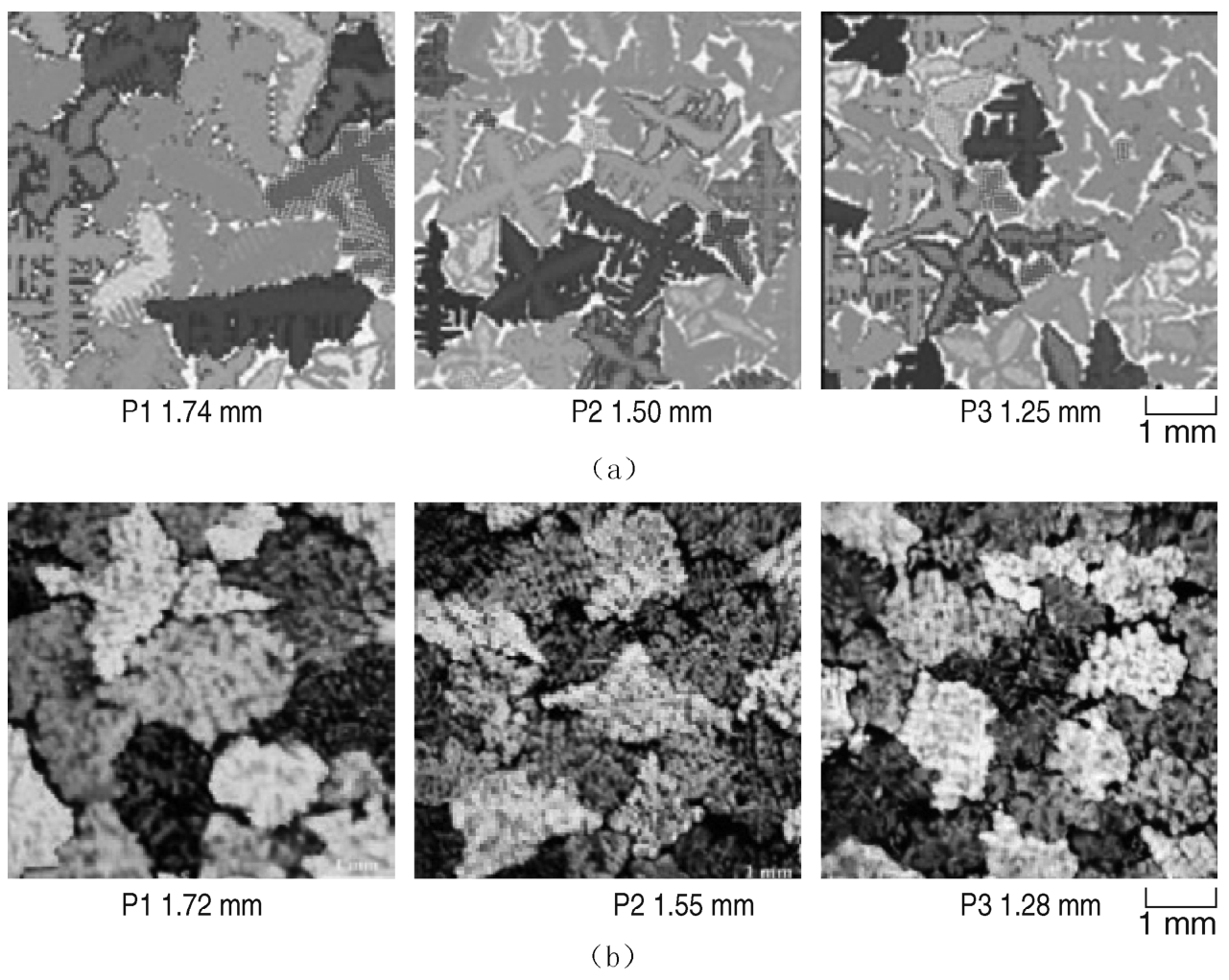 For an engineering case study, a modified CA model coupled with finite difference method was used to simulate the microstructure evolution of an aircraft turbine wheel casting of Al-7wt.%Si alloy. The casting shape and the position of the specimens are schematically shown in Figure 5, and the thinnest part of the casting is only 2mm in thickness. Specimens were taken from the longitudinal cross-section of the wheel casting indexed as P1 to P7 in sequence. The comparison between the simulated and experimental microstructure of different specimen is shown in Figure 6.