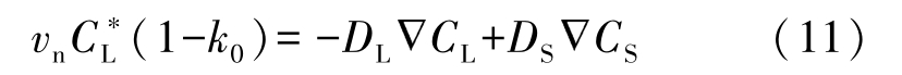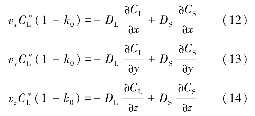 where C and D are the composition and solute diffusion coefficient, and the subscripts "L" and "S" means the liquid and solid, respectively, t is time, and k 0 is the solute partition coefficient.
