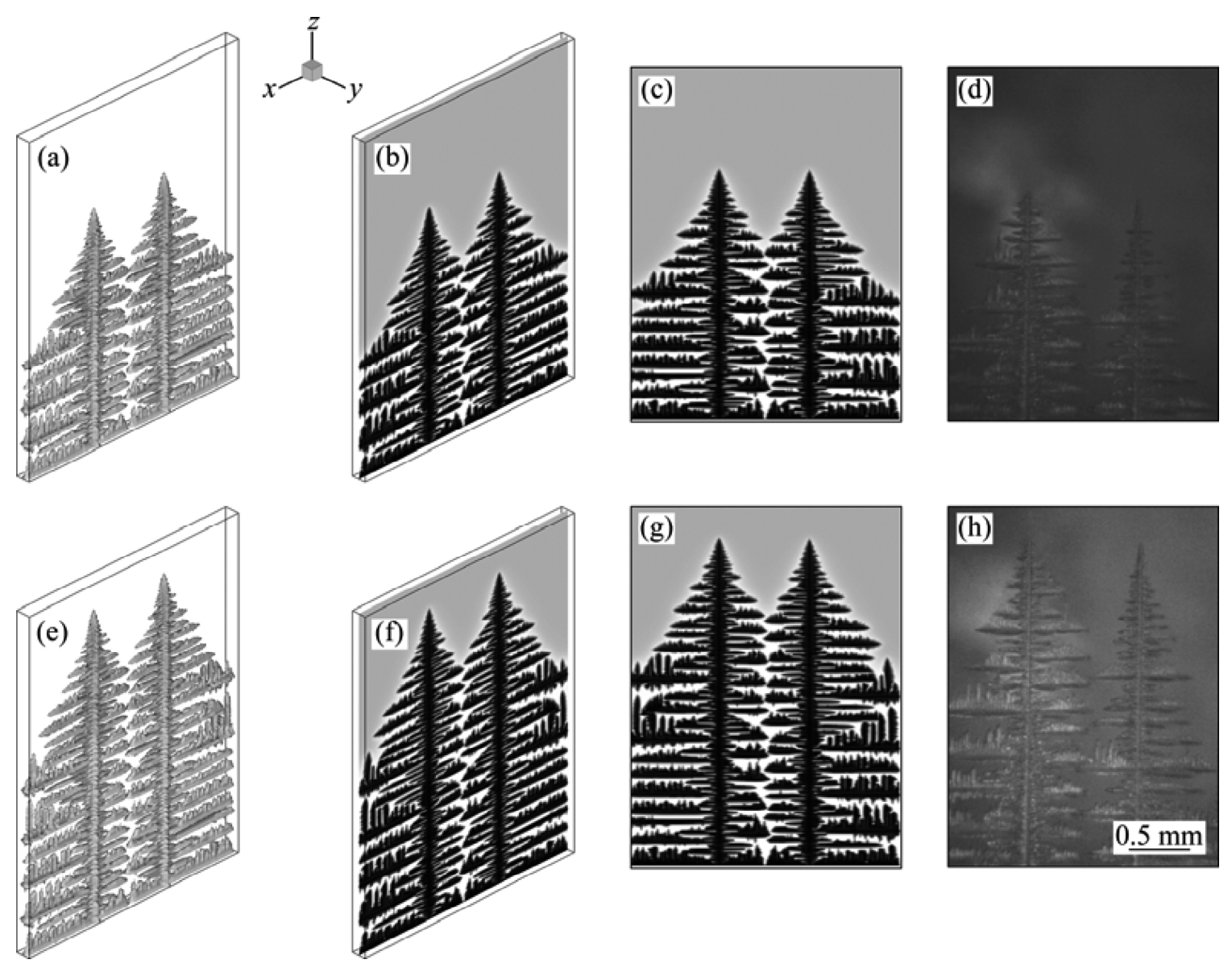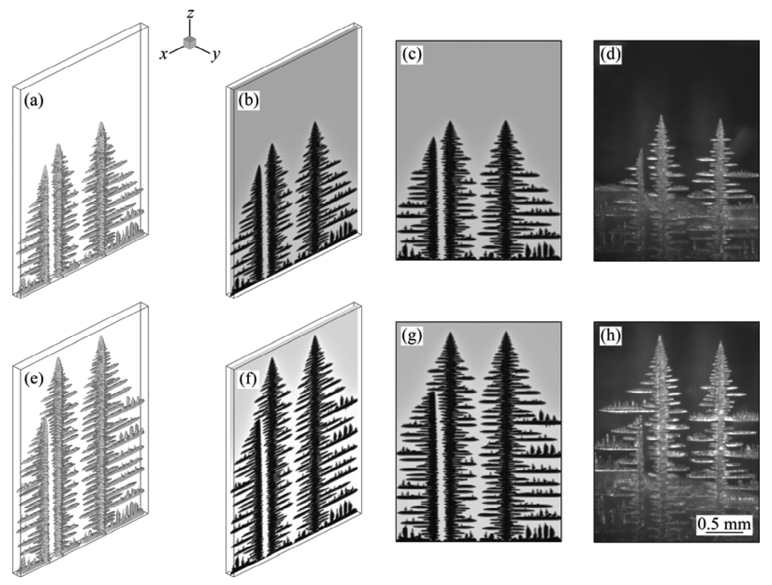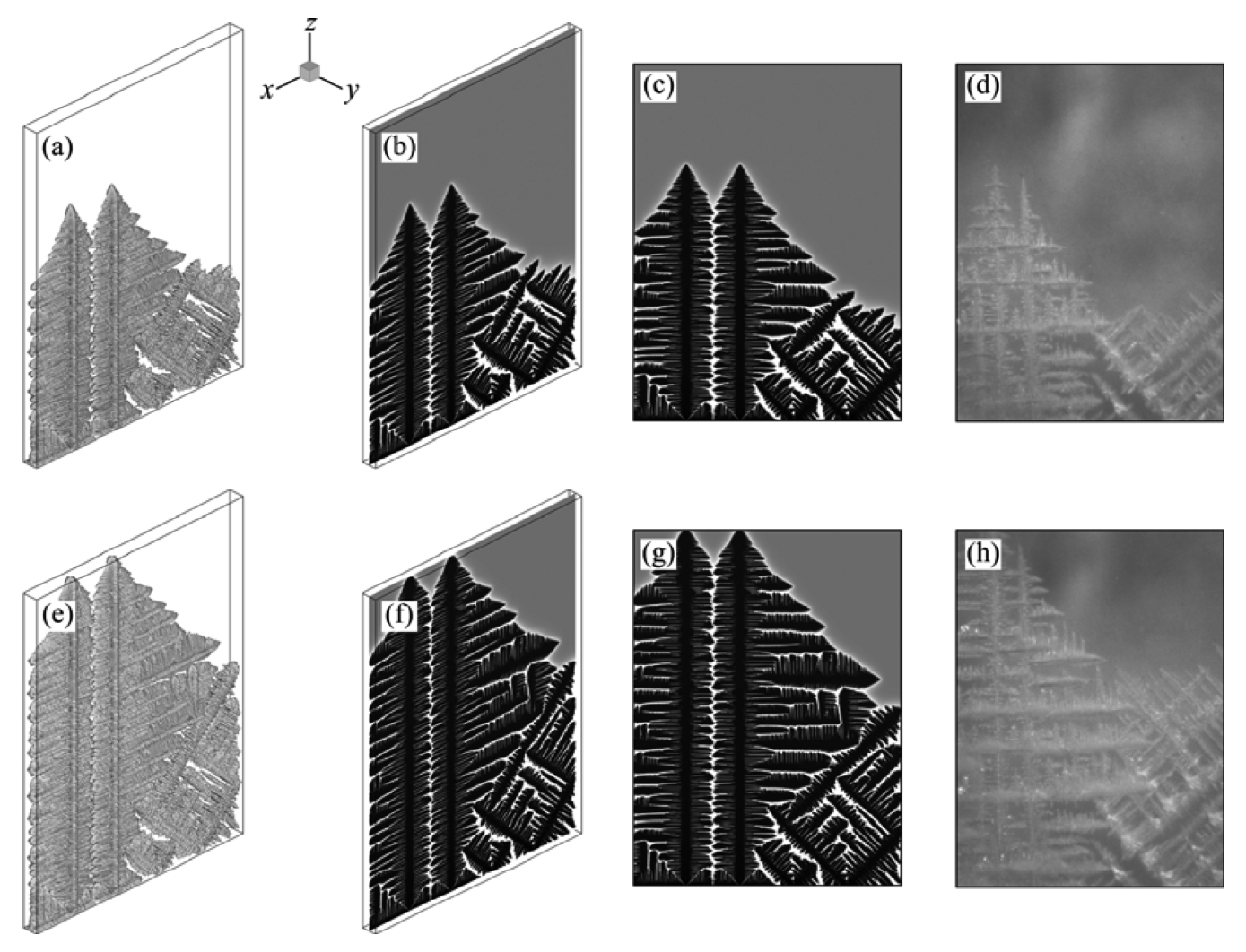 Fig. 4 Competitive growth of columnar dendrite of NH 4 Cl-74%H 2 O transparent alloy with different preferred growth orientations: (a) t =160s; (b,c) t =160s, x—z central slice; (d)Experimental result; (e) t =220s; (f,g) t =220s, x—z central slice; (h)Experimental result