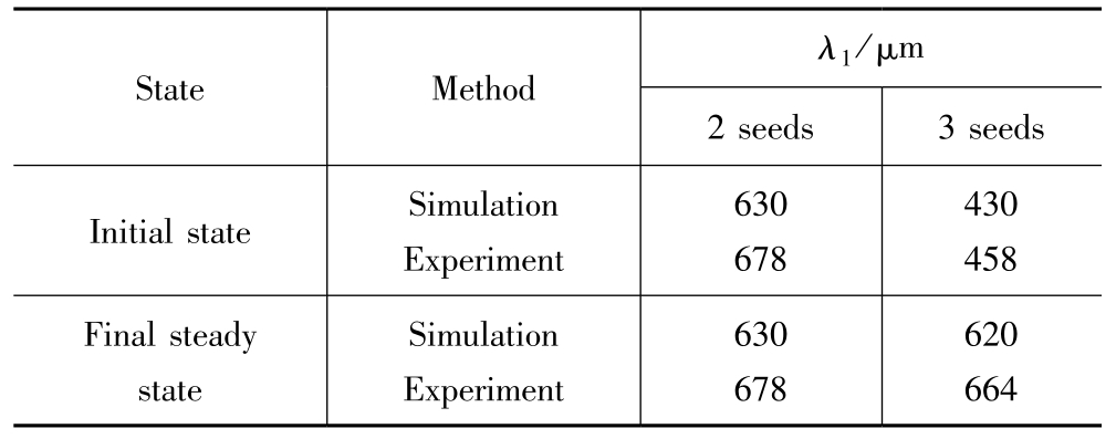 In classical models [4-6] , the growth of dendrites with different numbers of seeds could result in the same final primary dendrite arm spacing ( λ 1 ) when the solidification parameters were constant. λ 1 was determined as function of G and solidification rate v ( v ≈ v p ), λ 1 ∝ G -0.5 v -0.25 .From Table 1, it can be seen that a smaller dendrite was overgrown by its neighbors when the initial spacing was too narrow, and the final primary dendrite arm spacing in the simulation compared well with the experimental results.