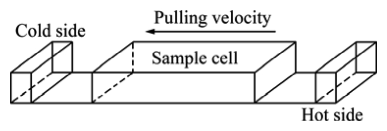 As shown in Fig. 1, NH 4 Cl-H 2 O transparent alloy was poured into a sample cell, and then subjected to directional solidification under constant pulling velocity ( v p ) in a horizontal heating and cooling system, which can supply a constant temperature gradient ( G ). During the directional solidification process, the dendrite growth was observed by a microscope in real time.