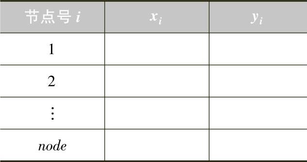 编号之后,依次将节点的坐标值有序排列成数组。二维问题,可用一个2列的二维数组或用两个一维数组,分别表示两个轴的坐标值,数组行数为节点总数,如表3.1所示(表中, node 为节点总数)。
