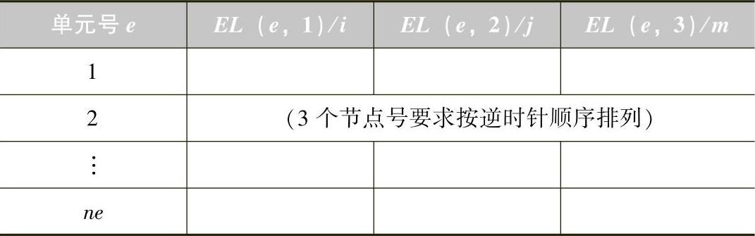 描述单元构成信息的数据就是围成单元的节点编号,按单元编号的顺序,逐一将构成单元的各个节点号 按逆时针顺序排列 起来。如三角形单元为3个节点,采用一个3列的二维数组表示,同一行上的3列元素表示一个单元的3个节点号,必须按逆时针有序填写,数组行数为单元总数,如表3.2所示(表中, ne 为单元总数)。