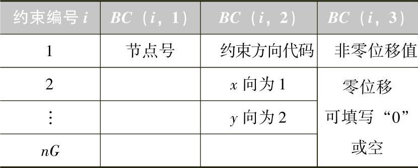边界条件限定的位移值通常为“0”,则位移约束的数据只要能够表明约束位置和约束方向即可。但有时限定的节点位移不为“0”,如在平地上停放的汽车,四轮约束位移均可为“0”;若其中某个车轮在凸台或凹坑位置时,该轮位移值不应为“0”。若存在非零位移约束,则应标明约束位移的大小和符号,与坐标轴正向一致时为正。因此,描述支座的约束数据可用一个3列的二维数组表示,依次表达每个位移约束的位置、约束方向、给定的位移值。如表3.3所示,数组 BC ( nG ,3),其中 nG 为约束总的数目,第1列为约束的位置,由节点号表示;第2列为限定位移的方向代码,方向代码应统一规定,不妨规定约束 x 方向为“1”,约束 y 方向为“2”;第3列为给定位移的大小。考虑到非零位移较少,为减少数据量,只需要列出非零位移值,零位移可不填写在表3.3的第3列中,程序会自动处理。