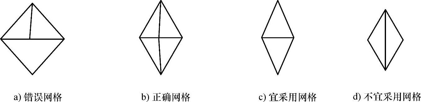 (3)单元的边长应尽可能接近 采用规则的锐角三角形单元可提高计算精度,同一单元中最长边与最短边之比不宜大于2,相邻单元尺寸应尽可能接近,图3.1c中的网格较宜,图3.1d中的网格不宜。