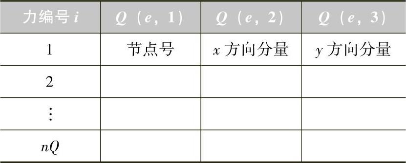 力有三要素,即作用点、作用方向和大小,力作用方向由在坐标轴上的分量确定。对集中力按作用点位置不同进行逐一编号。描述集中力的数据可用一个3列的二维数组表示,如表3.4所示,数组 Q ( nQ ,3),其中 nQ 为集中力的个数,第1列为集中力作用的位置,由节点号表示;第2与第3列为集中力在 x 与 y 方向上的分量大小,规定与坐标轴正向一致时为正值,与坐标轴正向相反时为负值。若某个节点只在一个方向上有集中力作用,则在另一方向对应的位置处填写“0”。
