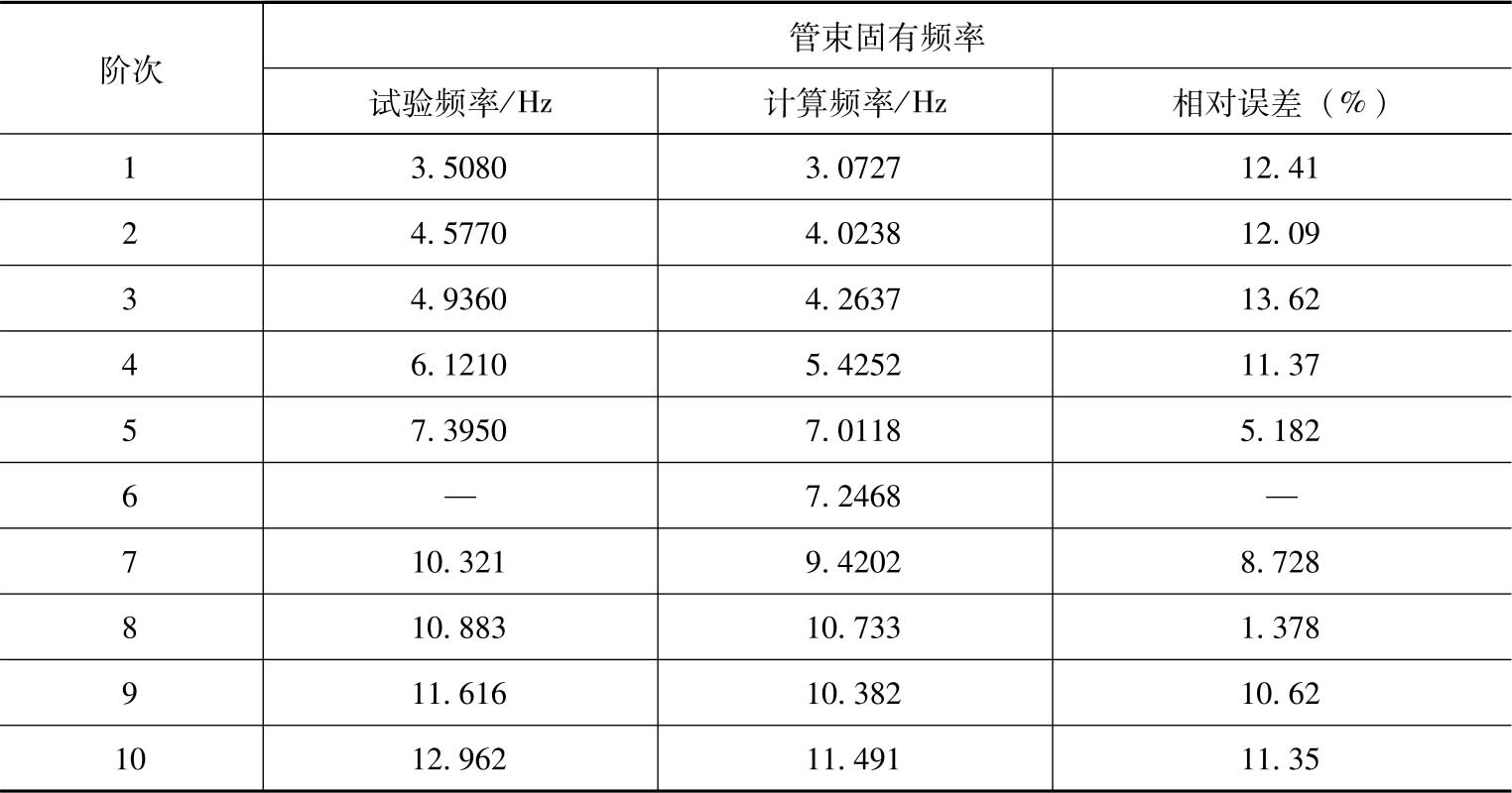 为了验证理论计算的准确性,建立如表1-11所示尺寸的锥螺旋管束模型,利用超单元技术计算管束子结构的质量矩阵和刚度矩阵,组建锥螺旋管束的总体矩阵,并建立管束的无阻尼振动方程,进而求解管束的固有频率。理论计算与试验测试的锥螺旋管束前10阶固有频率对比见表1-9。