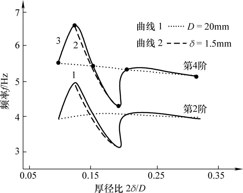 厚径比对螺旋管束固有频率的影响如图1-21所示,图中曲线为螺旋管束的第2、4阶固有频率的变化。当管束的截面直径保持 D =20mm不变时,随着壁厚的增大,螺旋管束的固有频率逐渐减小,如曲线1所示;当管束的壁厚保持不变( δ =1.5mm)时,随着截面直径的增大,管束的固有频率迅速增大,如曲线2所示。曲线3为综合比较厚径比的变化对螺旋管束固有频率的影响。可以看出,壁厚对管束固有频率的影响相对明显。