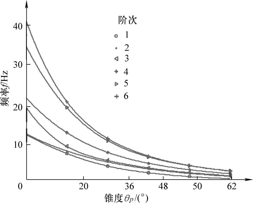 锥螺旋管束的一个显著特点就是其锥形螺旋结构,通过一定的锥度实现嵌套安装。锥度对管束固有频率的影响如图1-20所示,数值计算了锥度从0°~60°变化时螺旋管束的振动特性,随着锥度的增大,螺旋管束的固有频率迅速减小。例如第1阶模态,固有频率从12.7Hz减小到1.565Hz。同时,随着锥度的变化,其固有振型也发生变化。随着锥度的减小,锥螺旋渐变为等曲率的螺旋,在低阶频率范围内,其固有振型表现为纵向振动。