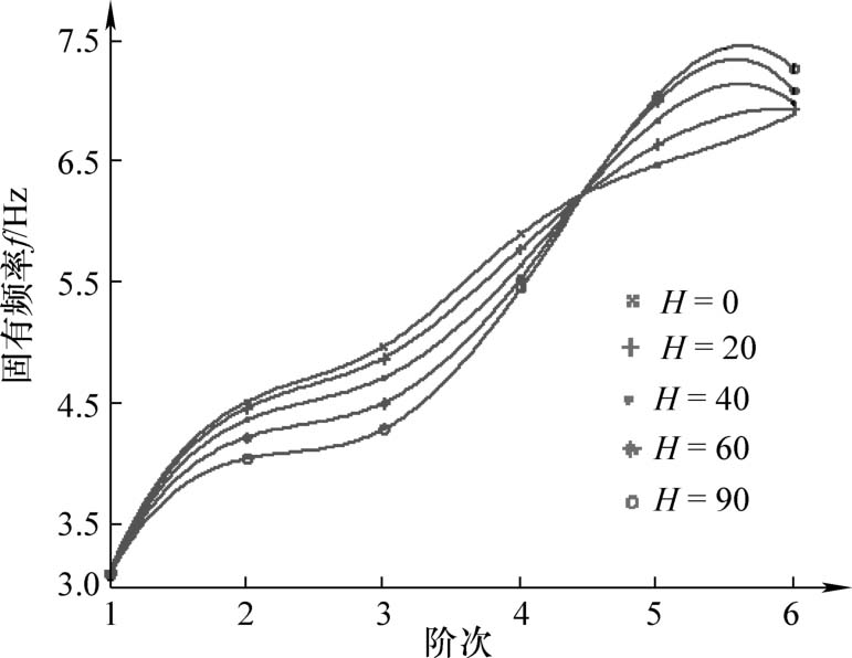 利用超单元结合固定界面模态综合法,分析螺距 H 变化对锥螺旋管束固有模态特性的影响。首先,从振型来看,随着螺距的变化,各阶模态均保持原有的振动形态,未出现纵向振动与横向振动的跳变。从固有频率来看,各阶频率的变化不同,例如第4阶频率,随着螺距的增大而增大,第5阶频率则随着螺距的增大而减小(见图1-19)。总体来看,螺距的变化对固有频率的影响比较小,当螺距从0~90mm变化时,对于纵向振动形态,锥螺旋管束的频率变化不超过9.2%;对于横向振动形态,频率增大了14%左右。
