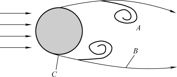 漩涡发放机理如图1-1所示,当流体横掠钝体前缘时,流体受到阻滞而使得压力增加,增高的压力围绕着圆柱体表面边界层从两侧向下游发展。当雷诺数较低时,压力不足以使边界层扩展到圆柱体背后,而是在圆柱体断面宽度最大点 C 附近产生分离,分离点即为沿柱体表面速度由正到负的转折点或者速度零点。在分离点的后方,流体沿柱体表面将发生回流。边界层在分离点脱离柱体表面,并形成向下游延展的自由剪切层,两侧剪切层之间即为图中的 A 区域,称为尾流区。在剪切层范围内,由于接近自由流区外侧部分,流速大于内侧部分,使得流体发生旋转,并分散成若干漩涡的趋势,柱体后面形成的漩涡系列称为“涡街” [1] 。