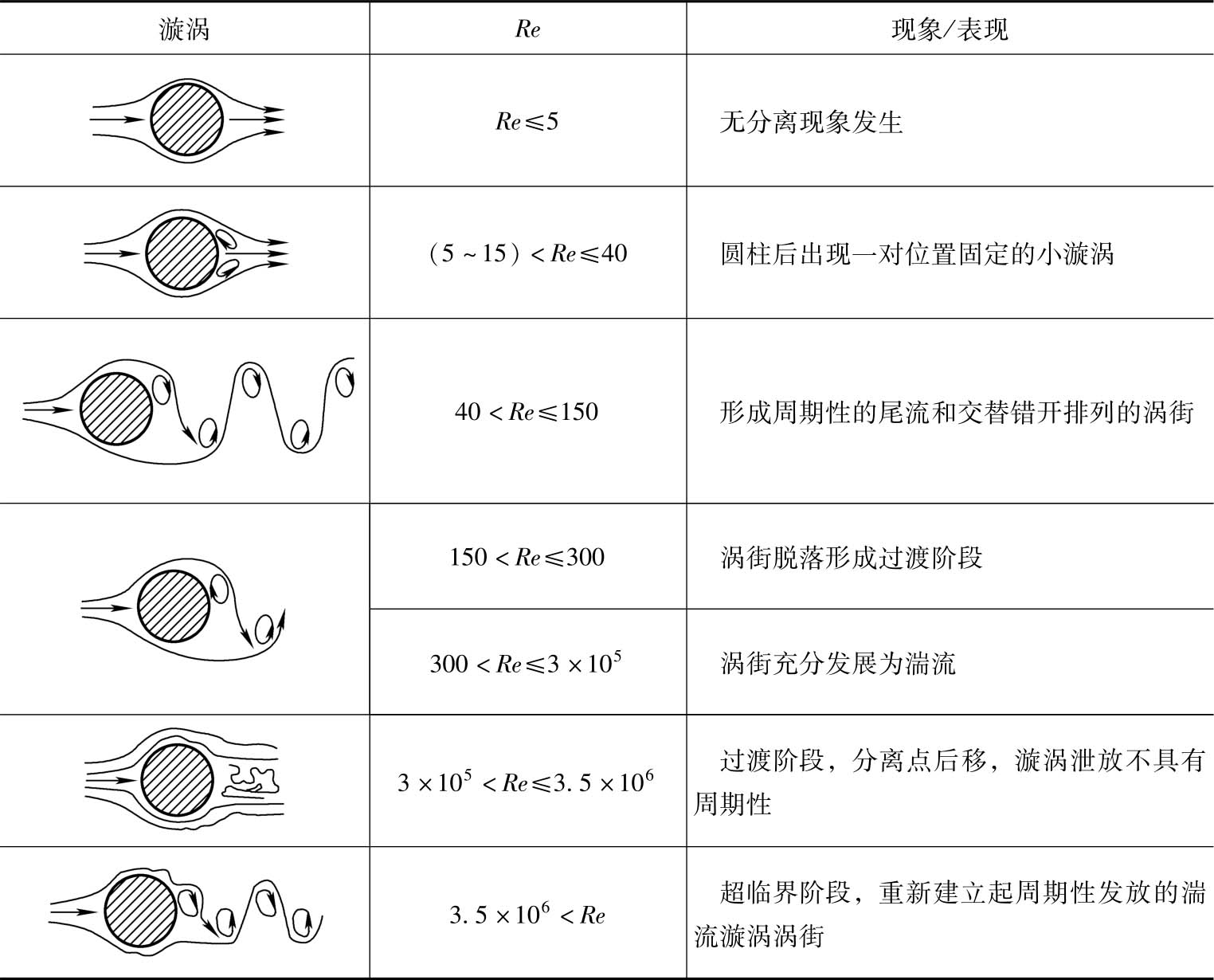 漩涡在尾流区的形状受雷诺数的影响很大,漩涡脱落与 Re 的关系见表1-1。当 Re ≤5时,流体紧贴圆柱流动而没有分离;当(5~15)< Re ≤40时,流体绕流圆柱后在圆柱后面形成一对位置固定的漩涡;随着流速的进一步增加,当40< Re ≤150时,漩涡被拉长,并交替地脱离圆柱体,形成一个周期性的尾流和交替错开排列的涡街,此时涡街为层状;当150< Re ≤300时,涡街脱落形成过渡阶段;当300< Re ≤3×10 5 时,涡街充分发展为湍流,圆柱尾部发放周期性交替泄放的湍流漩涡,并且湍流可延续至50 D 以外,称为次临界阶段;当3×10 5 < Re ≤3.5×10 6 时,称为过渡阶段,此时圆柱边界层的分离点后移,漩涡泄放不具有周期性(宽带发放频率),曳力显著降低;当3.5×10 6 < Re 时,称为超临界阶段,重新建立起比较规律的周期性发放的湍流漩涡涡街 [2] 。