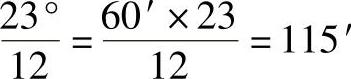 由图4-55可见,尺身两条刻线间的角度值为1°,尺身的23格与游标上的12格相等,则游标每一格(两条刻线间)的角度值为