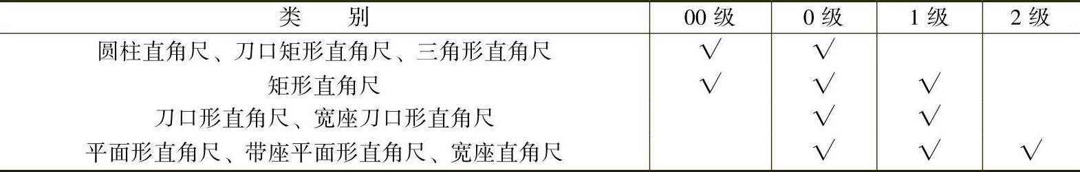 直角尺的制造精度有00、0、1和2四个精度级别。00级的精度最高,2级的精度最低。00级直角尺一般作为基准,在计量部门多用来检定低精度的直角量具。0级和1级直角尺用于检验精密工件,2级直角尺则用于检验一般工件。各种直角尺的制造精度见表4-13。