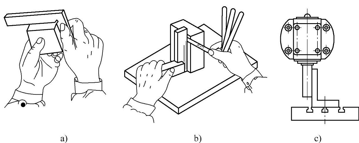 a)测量工件的直角 b)测量垂直度误差 c)基准校正