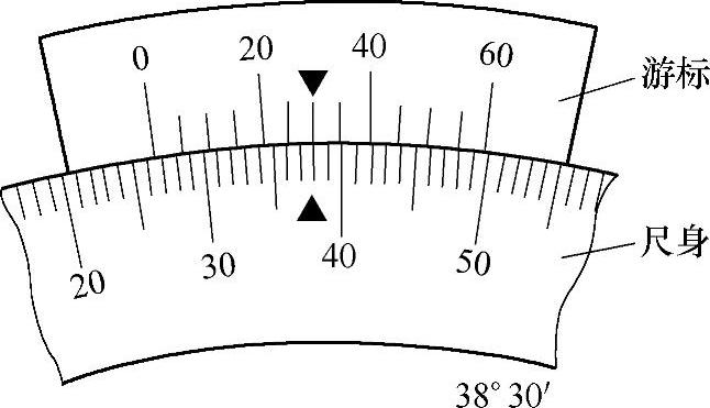 这就是分度值为5′的游标万能角度尺的读数原理。同理也可得到分度值为2′和10′的游标万能角度尺的读数原理。
