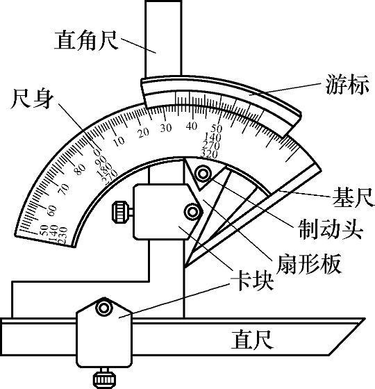 游标万能角度尺由直角尺、尺身、直尺、基尺、游标、扇形板、卡块和制动头组成(图4-55)。基尺固定在尺座上,直角尺由两个卡块固定在扇形板上,直尺用支架固定在直角尺上(如果拆下直角尺,也可以将直尺固定在扇形板上)。
