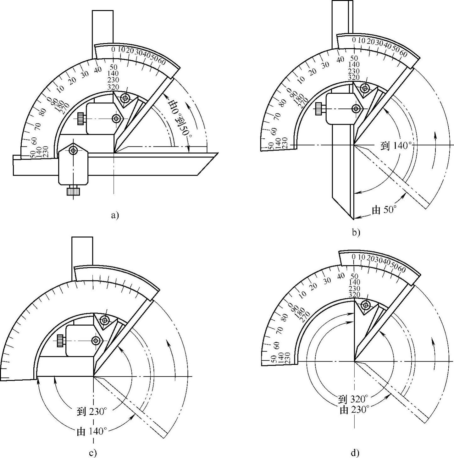 直角尺和直尺全装上时,可测量0°~50°的外角度(图4-57a);仅装上直尺时,可测量50°~140°的角度(图4-57b);仅装上直角尺时,可测量140°~230°的角度(图4-57c);把直角尺和直尺全拆下时,可测量230°~320°的角度,即可测量40°~130°的内角度(图4-57d)。