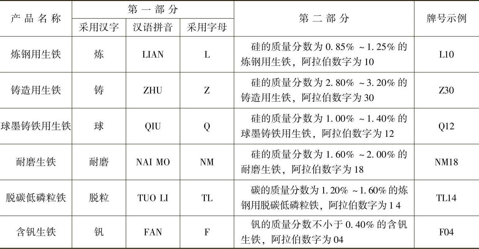 生铁牌号表示方法见表1-2。