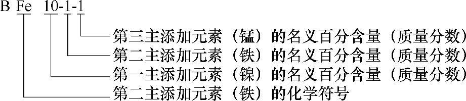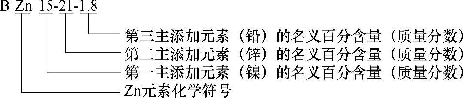 2)复杂白铜包括铜为余量的复杂白铜和锌为余量的复杂白铜:①铜为余量的复杂白铜,其牌号用“B+第二主添加元素化学符号+镍含量(质量分数)+各添加元素含量(质量分数,数字间以“-”隔开)”来表示;②锌为余量的锌白铜,其牌号用“B+Zn元素化学符号+第一主添加元素(镍)含量(质量分数)+第二主添加元素(锌)含量(质量分数)+第三主添加元素含量(质量分数,数字间以“-”隔开)”来表示。示例如下: