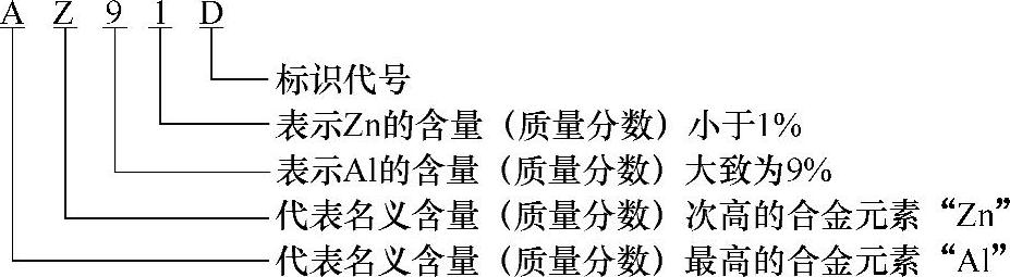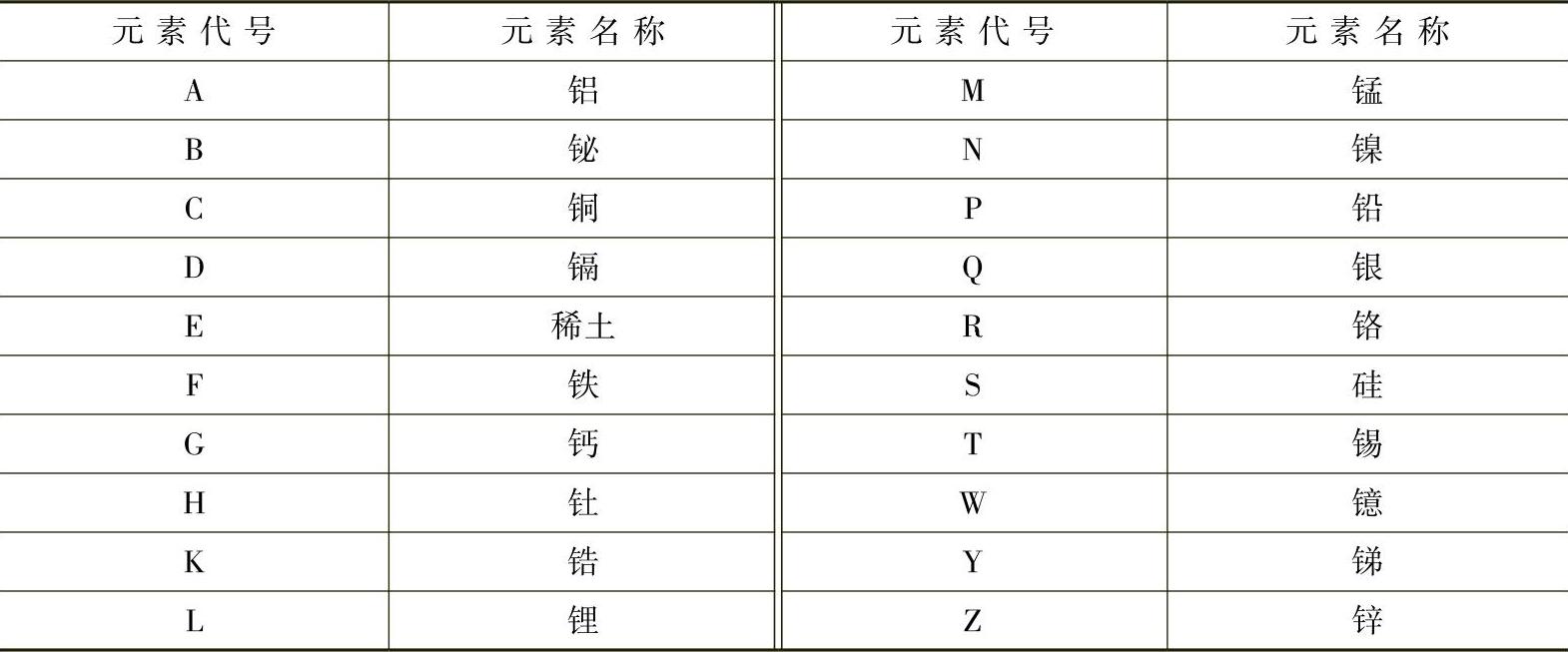 (2)镁合金 镁合金牌号以英文字母加数字再加英文字母的形式表示。前面的英文字母是其最主要的合金组成元素代号(元素代号符合表1-12的规定,可以是一位也可以是两位),其后的数字表示其最主要的合金组成元素的大致含量。最后面的英文字母为标识代号,用以标识各具体组成元素相异或元素含量有微小差别的不同合金。