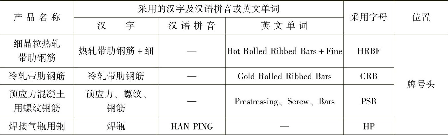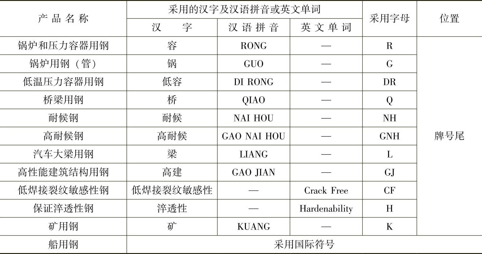 表 1-7 专用结构钢的前缀符号
