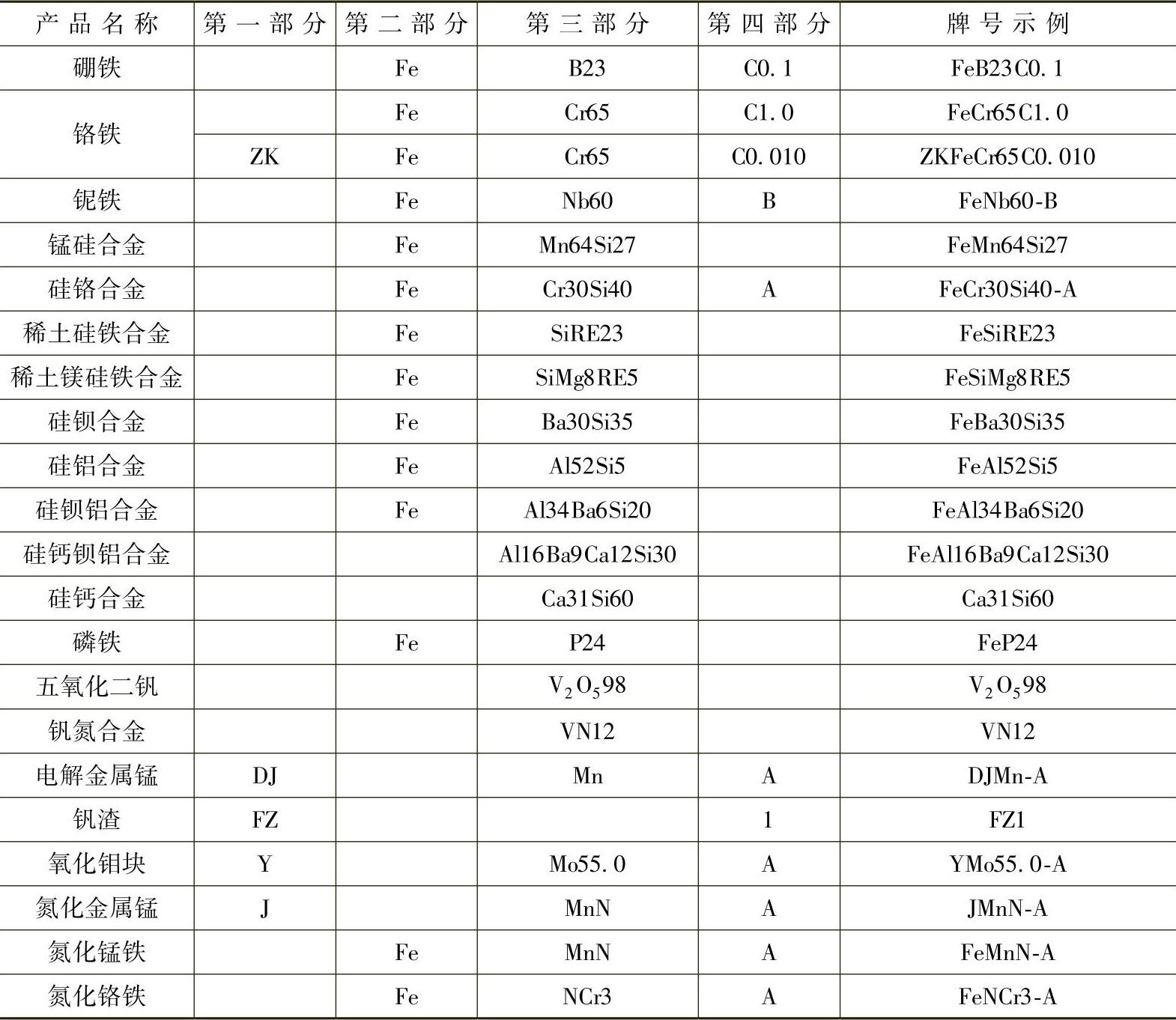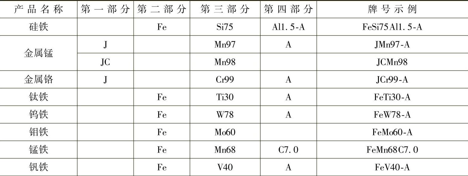 表 1-4 铁合金牌号表示示例