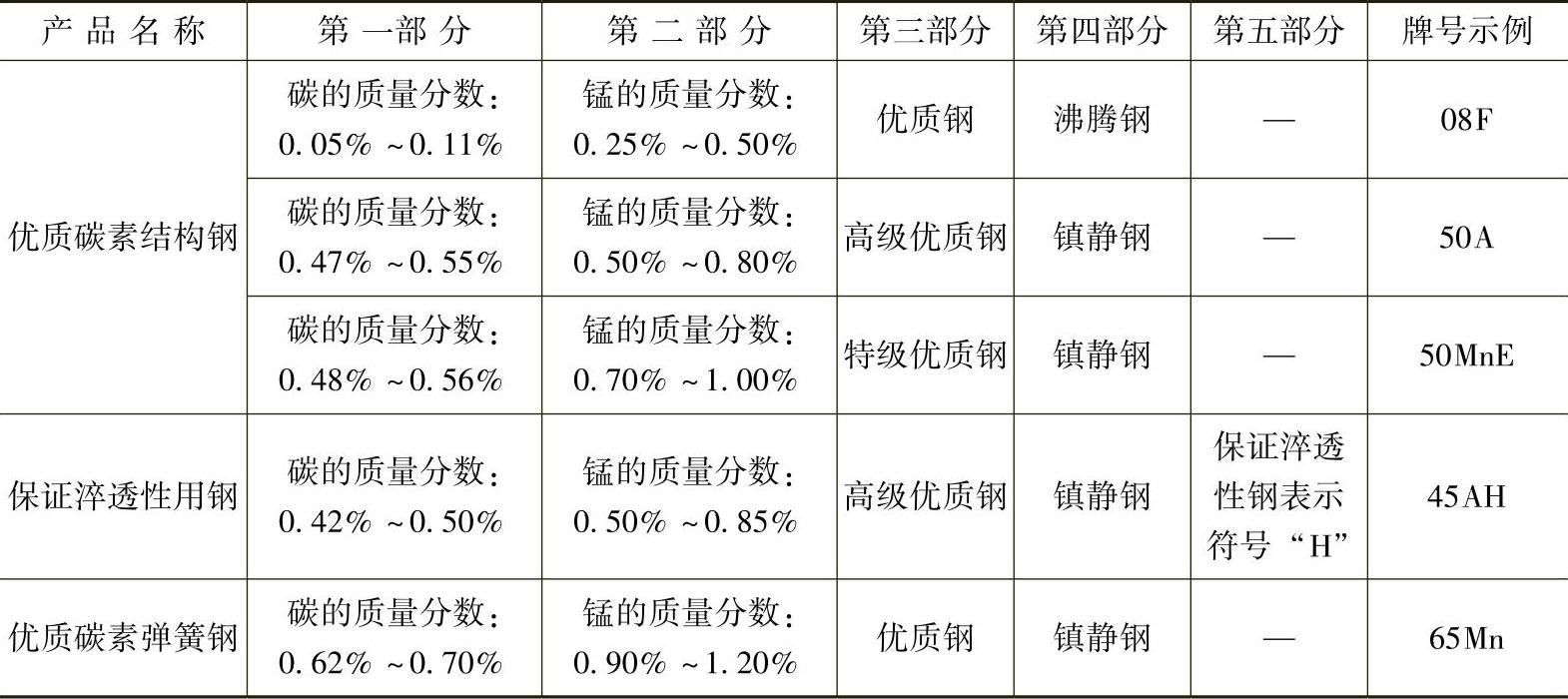 表 1-10 优质碳素结构钢和弹簧钢的牌号示例