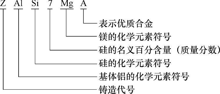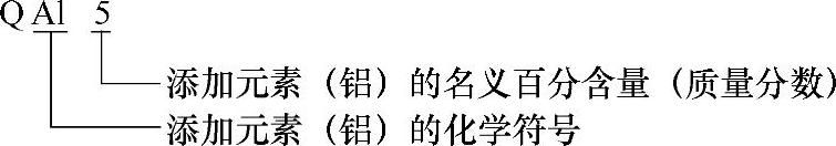 (2)铸造有色合金 铸造有色合金牌号由铸造代号“Z”和基体金属的化学元素符号、主要合金的化学元素符号(其中混合稀土元素符号统一用RE表示),以及表明合金元素名义百分含量的数字组成。对杂质限量要求严、性能高的优质合金,在牌号后面标注大写字母“A”。示例如下:
