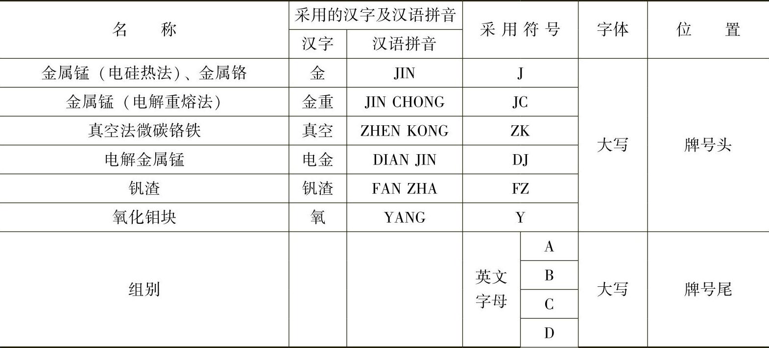 1)铁合金产品名称、用途、工艺方法和特性表示符号见表1-3。