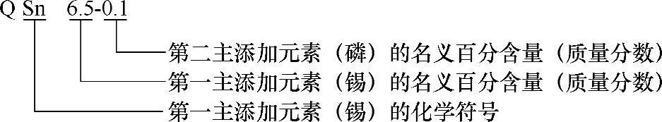 青铜的牌号用“Q+第一主添加元素化学符号+各添加元素含量(质量分数,数字间以半字线隔开)”来表示。其牌号的表示示例如下: