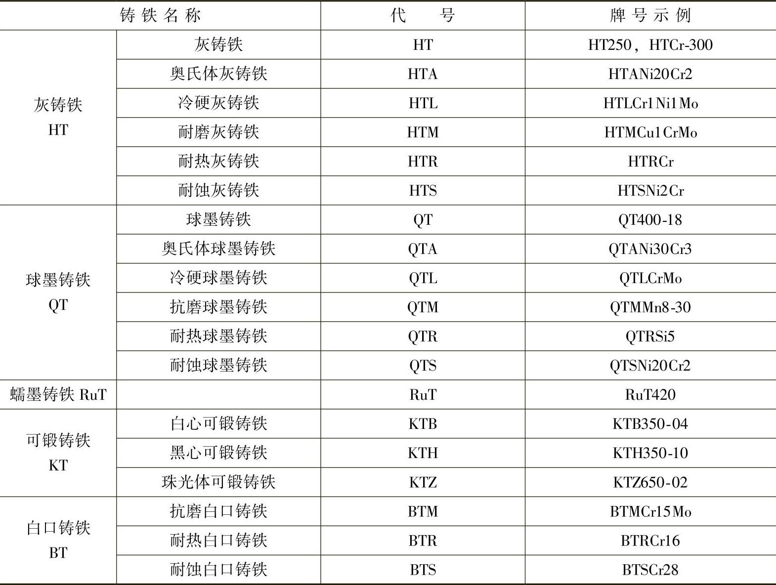 (3)各种铸铁名称、代号及牌号示例(见表1-5)