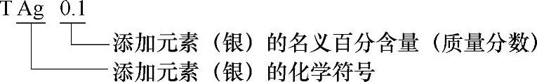 2)无氧铜的牌号用“TU+顺序号”或“TU+添加元素的化学符号+各添加元素含量(质量分数)”来表示。示例如下: