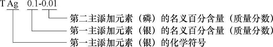 1)铜的牌号用“T+顺序号”或“T+第一主添加元素化学符号+各添加元素含量(质量分数,数字间以半字线隔开)”来表示。示例如下: