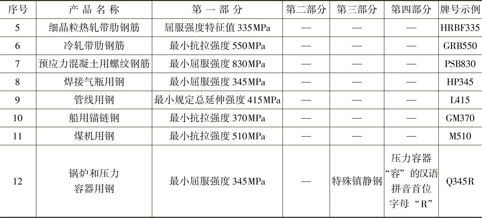 第一部分:前缀符号+强度值(以MPa为单位),其中通用结构钢前缀符号为代表屈服强度的拼音的字母“Q”。专用结构钢的前缀符号见表1-7。