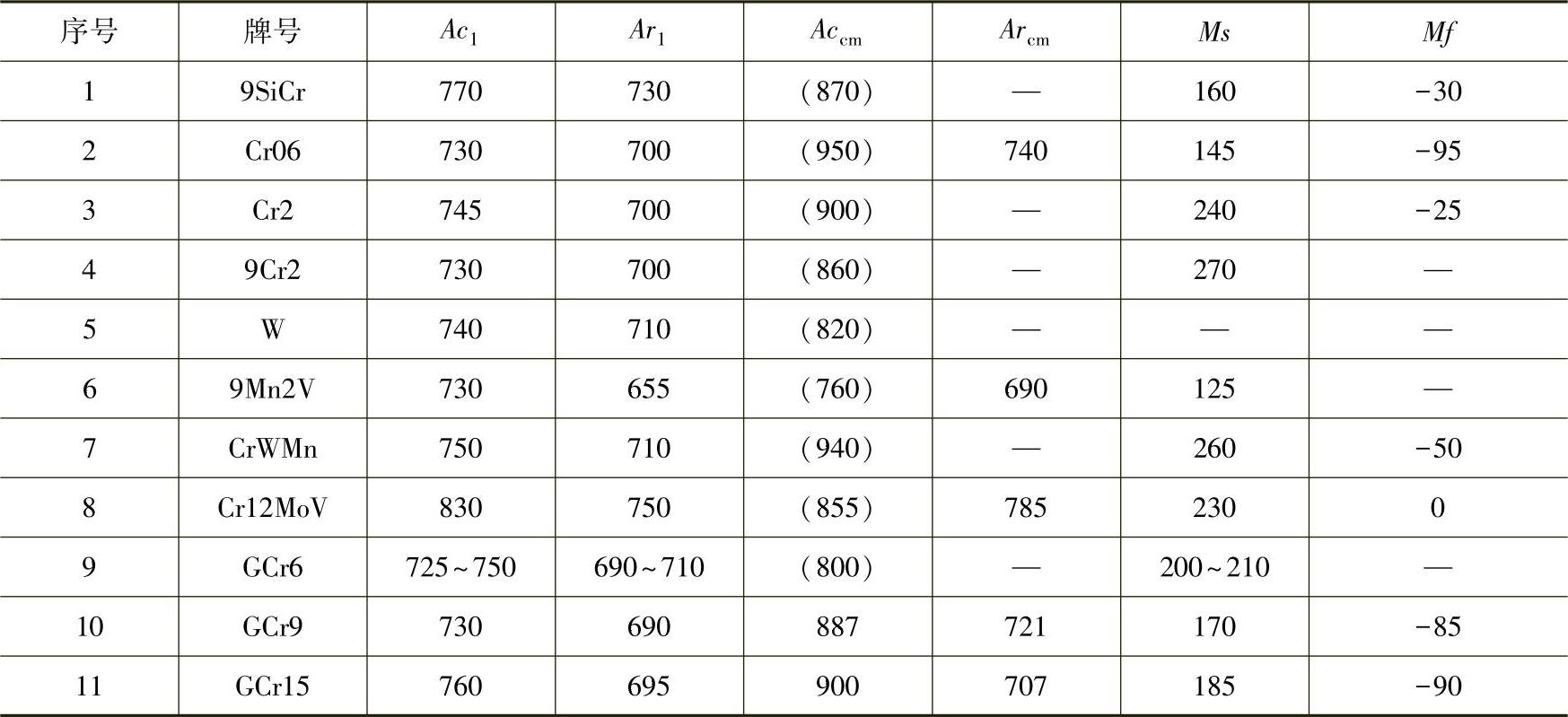 在实际生产中加热和冷却的相变点更有实用价值,是确定钢的淬火加热温度,正火加热温度和退火加热温度和钢的冷处理的依据。常用工具钢的临界点见表2-2~表2-4。