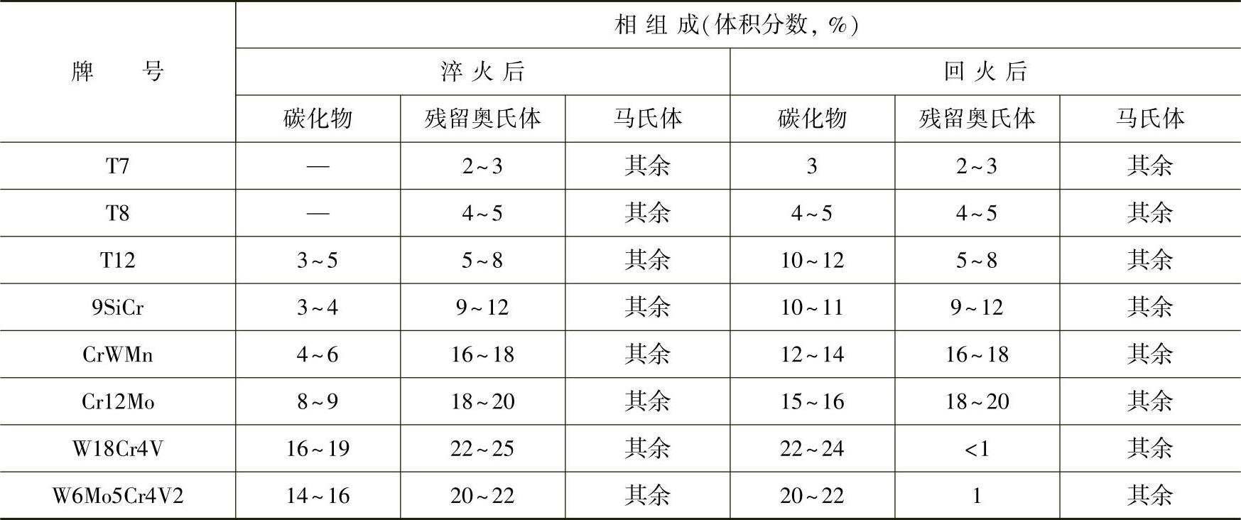 表2-1所叙列的只是通常情况下淬火回火后工具钢的相组成情况,伴随淬火加热温度和淬火冷却方法的不同其相组成情况会有所不同。例如,高合金工具钢采用分级淬火和等温淬火时相组成会有较大的变化,高速钢采用等温淬火时会产生贝氏体组织。