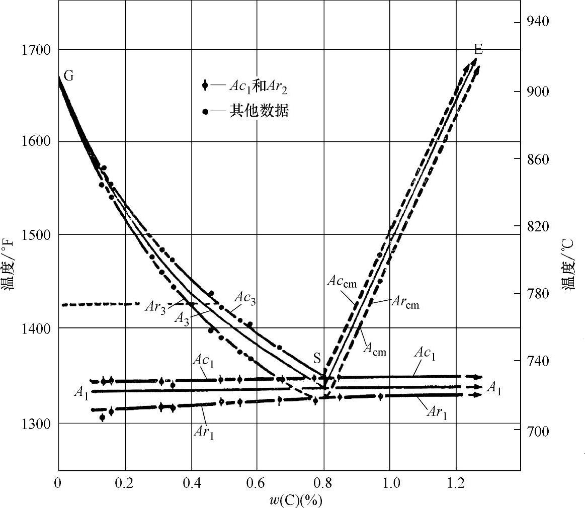 铁碳相图上的临界点是平衡状态下的临界点,但是在钢中发生的转变是受扩散控制的,临界点对于加热和冷却的速率很敏感,因此实际上加热和冷却时的临界点与平衡状态下的临界点有所偏离,为更准确的表达相变的温度,必须将加热和冷却的临界点区分开来。如图2-1所示,加热时的临界点以“c”代表,冷却时的临界点以“r”代表: