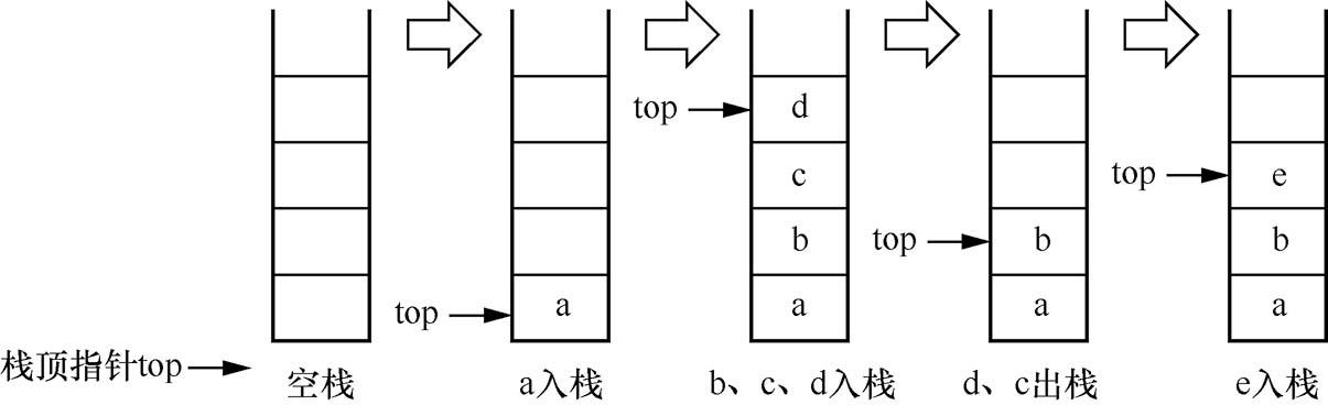 堆栈的主要特点是“后进先出”,即后入栈的元素先出栈。每次入栈的数据元素都放在当前栈顶之上,成为新的栈顶元素,每次出栈的数据元素都是当前栈顶元素,如图2.1所示。